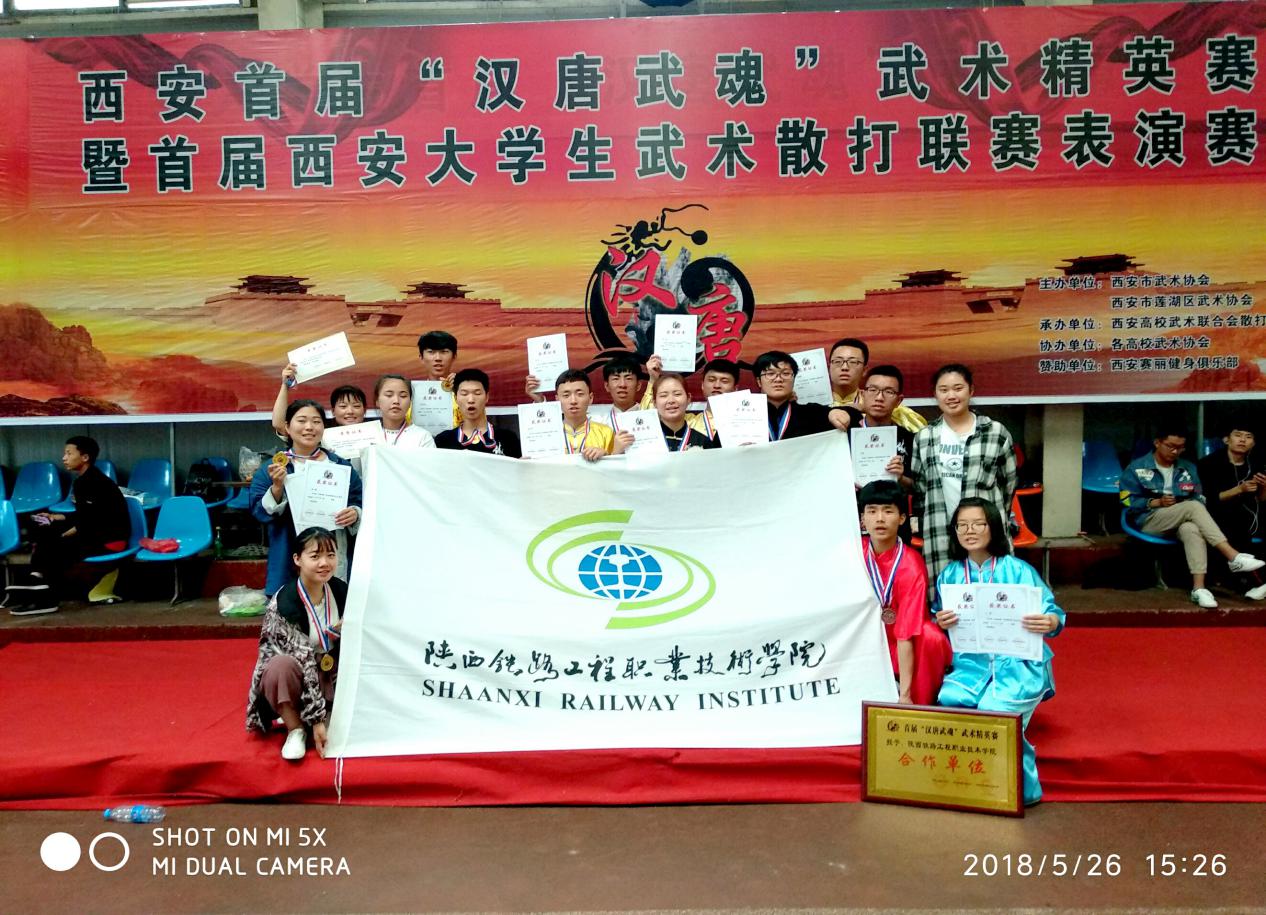 学院武术队从不同系部选拔的16名学生参加了本次比赛,由张骏老师领队,任飞老师担任教练。在学院和体育部的领导的大力支持下,学院武术队与全省30余所高校武术运动员同台竞技,在比赛中发扬“吃苦奉献,拼搏争先”的铁院精神,最终获得集体项目团体一等奖,男子、女子单器械类和男子、女子拳术类一等奖的好成绩,同时我院被比赛主办方西安市武术协会、西安高校武术联合会授予赛事合作单位。(任飞)