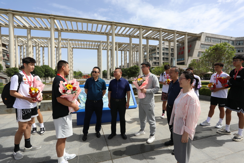 530日上午,学校在高新校区南门口举行欢迎仪式,热烈欢迎凯旋的铁院健儿们,学校副校长张学钢、祝和意出席,教务处处长刘超群,基础课部主任韩茂源等师生代表参加。仪式上,张学钢副校长、祝和意副校长为教练员和运动健儿送上鲜花表达祝贺,并同他们亲切交谈,鼓励球员们再接再厉,发扬学校“吃苦奉献、拼搏争先”的精神,争取在CUBAL全国总决赛取得优异成绩。侯豫星