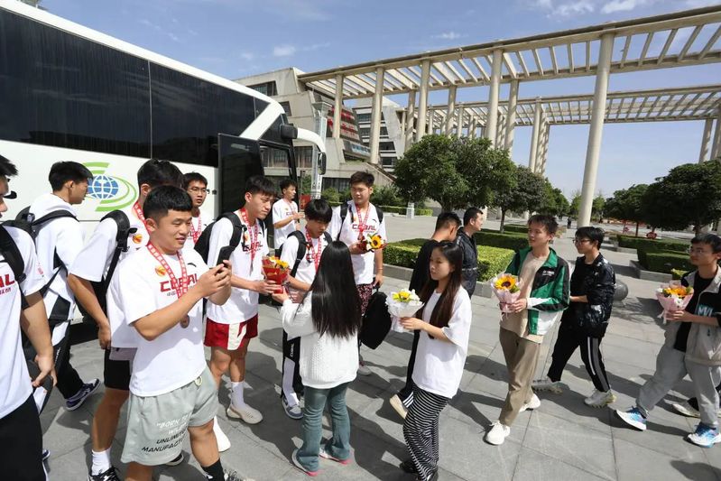 530日上午,学校在高新校区南门口举行欢迎仪式,热烈欢迎凯旋的铁院健儿们,学校副校长张学钢、祝和意出席,教务处处长刘超群,基础课部主任韩茂源等师生代表参加。仪式上,张学钢副校长、祝和意副校长为教练员和运动健儿送上鲜花表达祝贺,并同他们亲切交谈,鼓励球员们再接再厉,发扬学校“吃苦奉献、拼搏争先”的精神,争取在CUBAL全国总决赛取得优异成绩。侯豫星