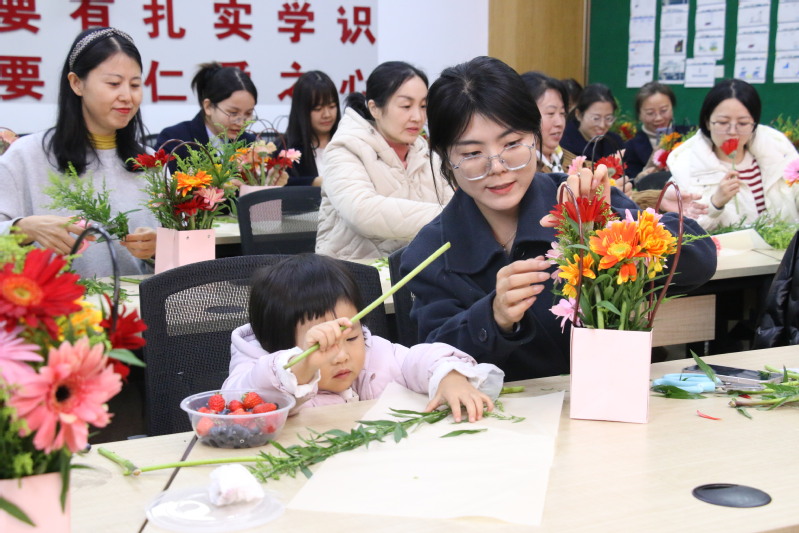 活动特别邀请专业花艺师现场授课,为大家讲解插花艺术的基本知识、技巧和色彩搭配。在花艺师的指导下,女教职工们充分发挥想象力和创造力,用心挑选花材,精心设计造型,将一朵朵鲜花错落有致地搭配在一起,创作出一件件独具匠心、赏心悦目的插花作品。活动现场花香四溢,欢声笑语不断,大家沉浸在创作的乐趣中,感受着艺术的魅力。大家纷纷表示,通过活动学习了插花技艺,陶冶了情操,放松了身心,增进了彼此之间的交流与沟通,增强了基础分会的凝聚力和向心力,将以更加饱满的热情和更加昂扬的斗志投入到今后的工作中,为学校发展贡献自己的力量。在专业花艺师现场指导下,老师们感受花艺魅力,绽放指尖优雅。休息阶段,教师职工们纷纷围坐在一起,畅谈心得感受,分会为精心为大家准备了可口的蛋糕,多巴胺舞动浪漫;甜蜜时光,品味幸福。愿“女神们”在未来日子里,心怀热爱,勇敢追梦,活出精彩,绽放光芒!