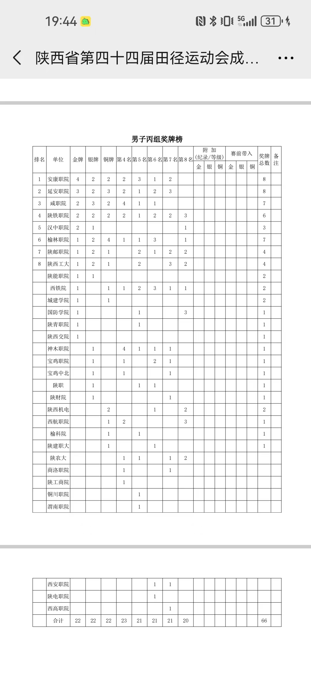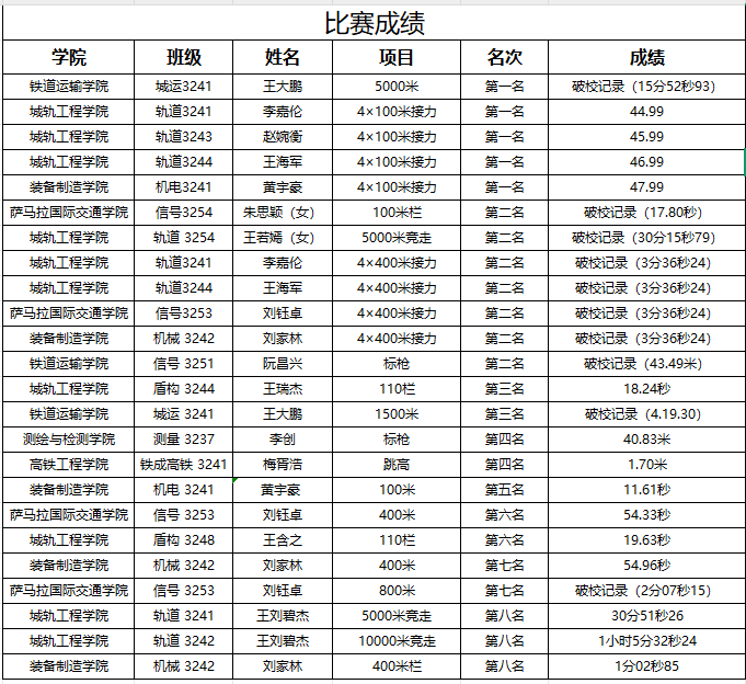 经过四天的激烈角逐,我校田径代表队充分发扬“吃苦奉献、拼搏争先”的校训,在本次比赛中斩获2枚金牌、4枚银牌、2枚铜牌,其中7个项目打破学校纪录,最终男子丙组奖牌榜排名第四,男子团体总分第五,男女团体第六。